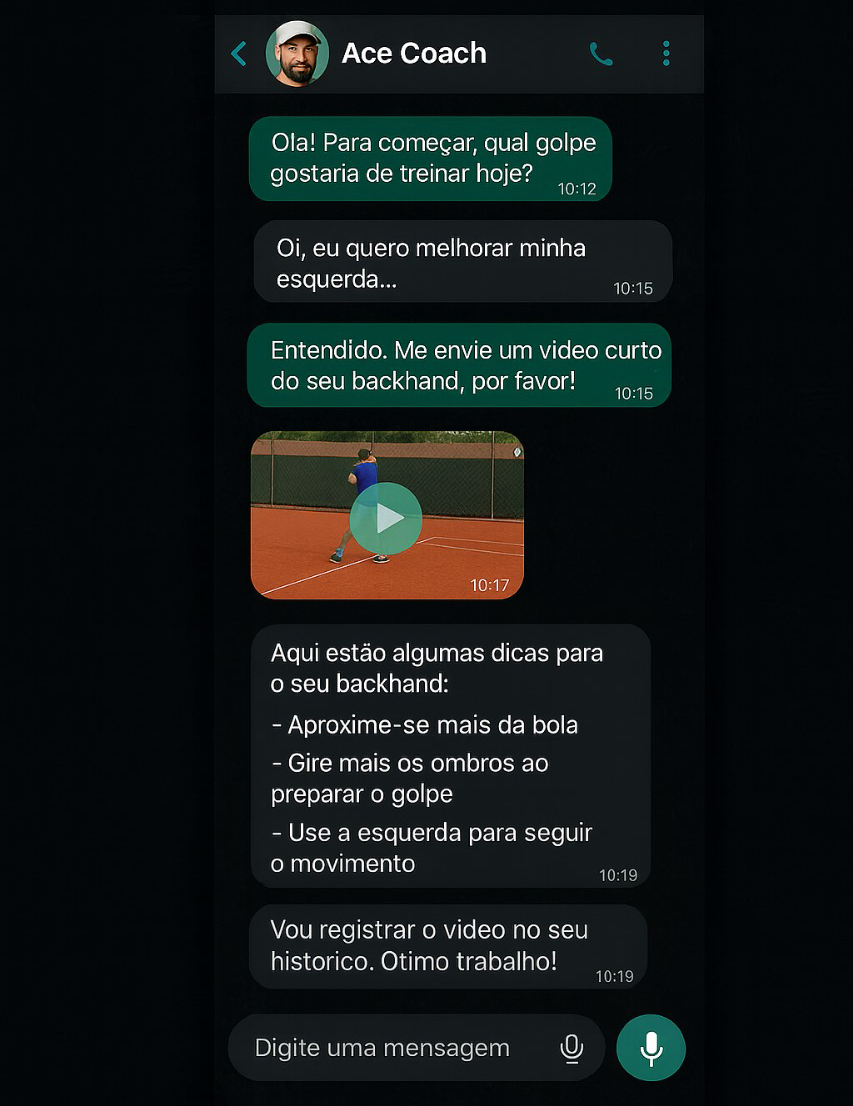 O Ace Coach é um complemento inovador para sua jornada no tênis, ideal para tenistas amadores que buscam uma orientação constante e personalizada. Ele não substitui completamente o toque humano de um professor presencial para correções físicas imediatas, mas oferece um suporte inigualável via WhatsApp, com feedback técnico detalhado (análise de vídeos), estratégias de jogo, planejamento de treinos e um poderoso módulo de treinamento mental e emocional. É a solução perfeita para quem busca evoluir sem depender exclusivamente de aulas presenciais e ter um “treinador de bolso” sempre disponível.a