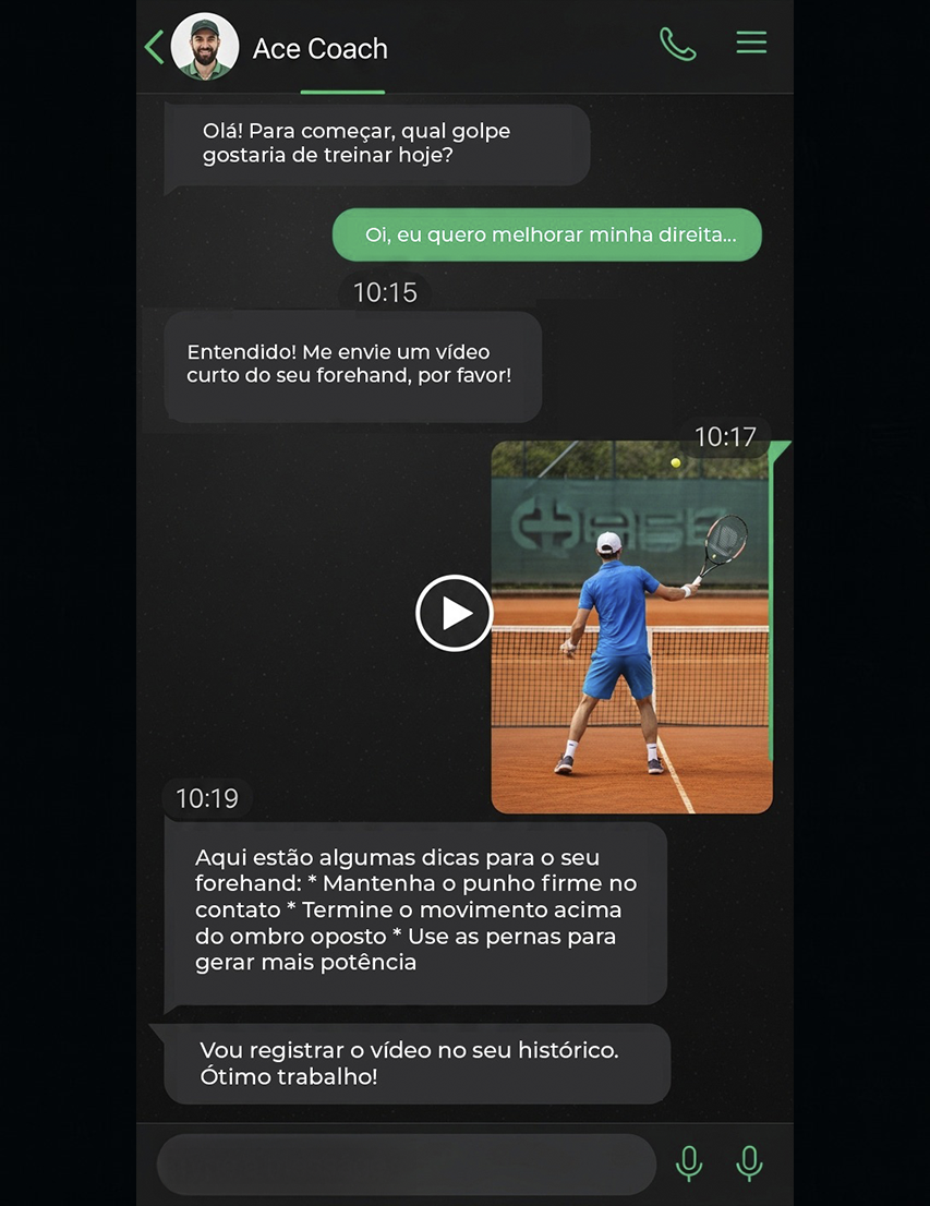 Sim, o envio de vídeos é uma funcionalidade chave! Você pode enviar vídeos curtos dos seus principais golpes (forehand, backhand, saque, slice e voleio) de diferentes ângulos via WhatsApp. A IA do Ace Coach fará uma análise técnica detalhada de postura, execução e tempo de bola, enviando um feedback escrito personalizado. É uma forma prática de receber correções e acompanhar sua evolução, com o histórico dos vídeos sempre disponível para comparação.